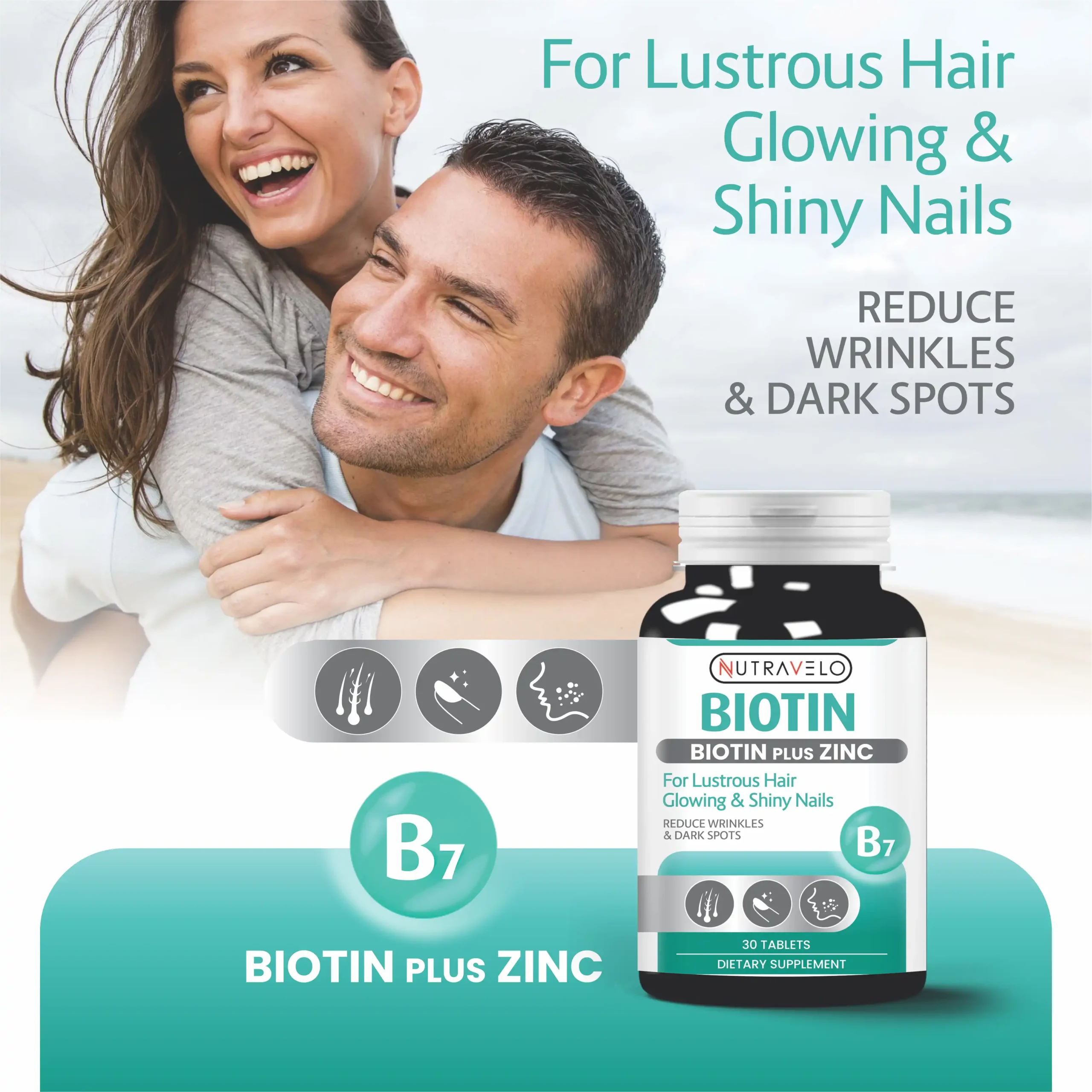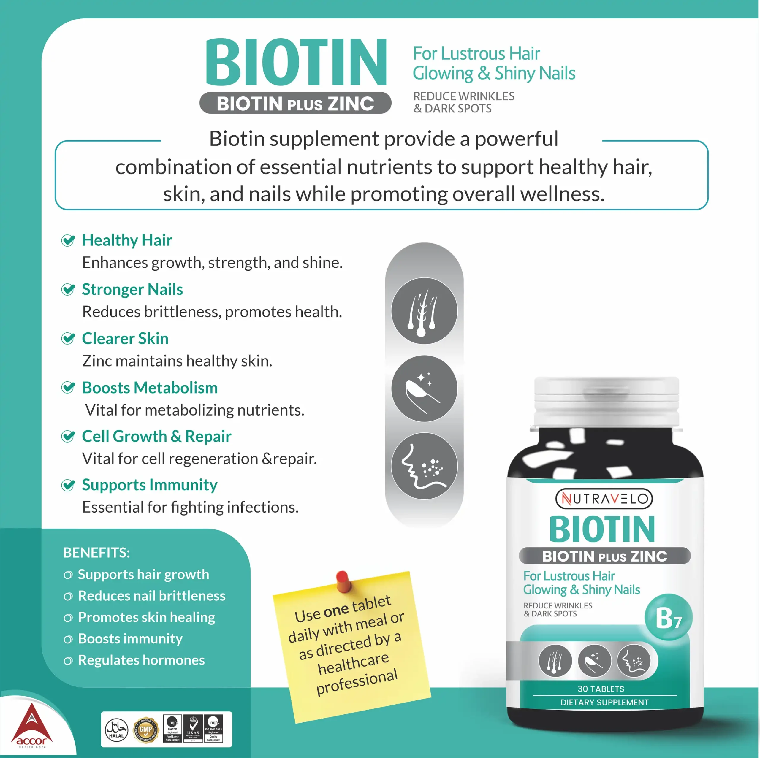 Biotin + Zincpng supplement provide a powerful combination of essential nutrients to support healthy hair, skin, and nails while promoting overall wellness.
