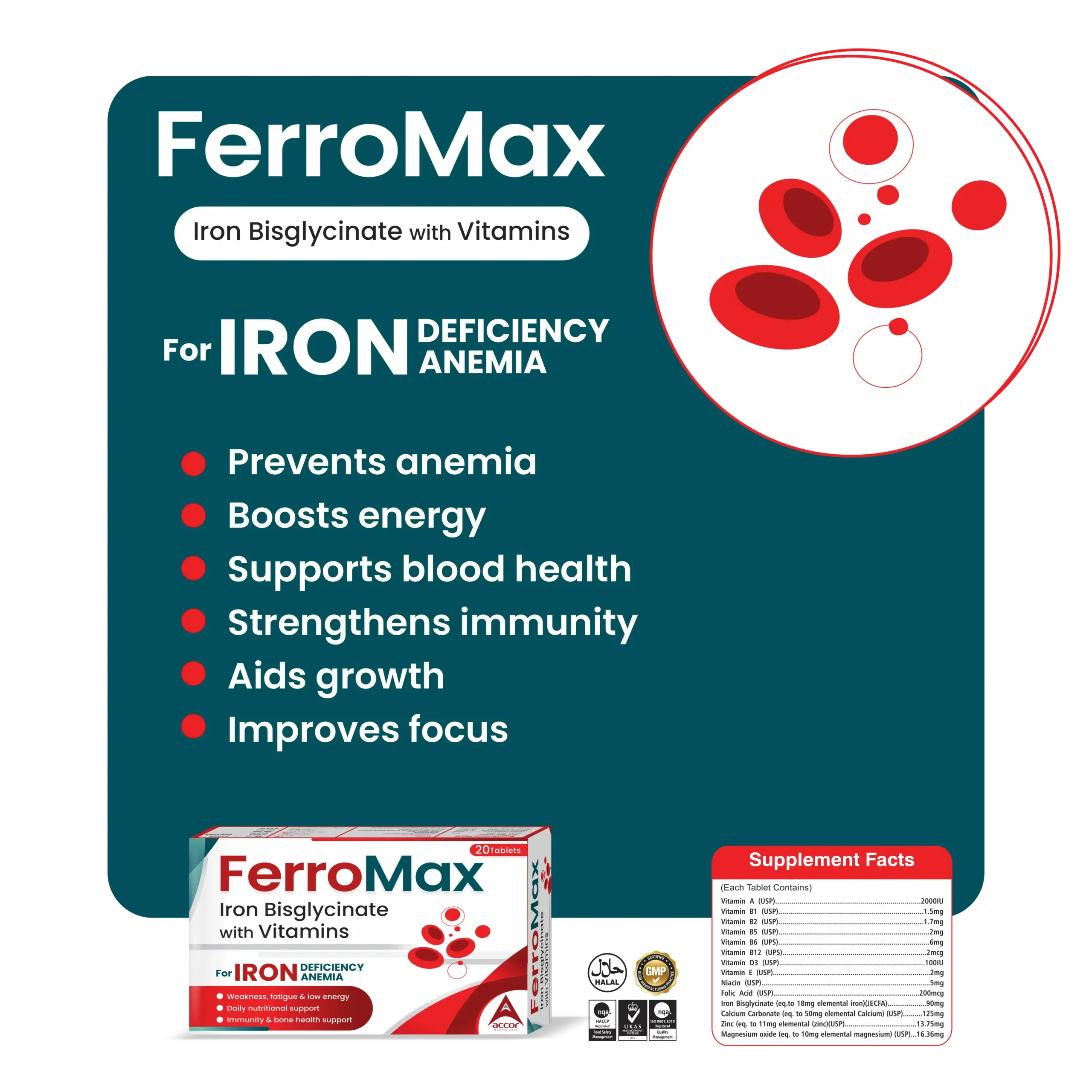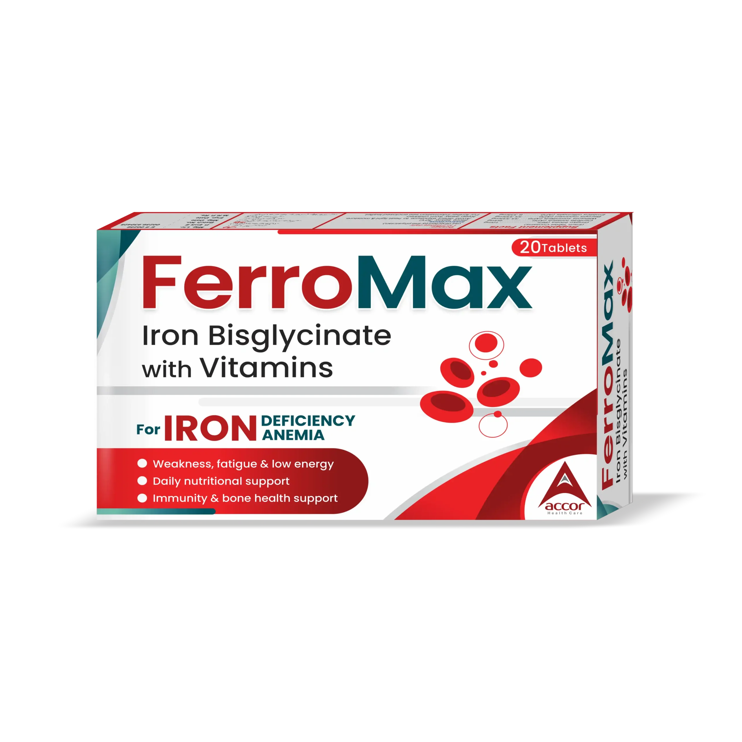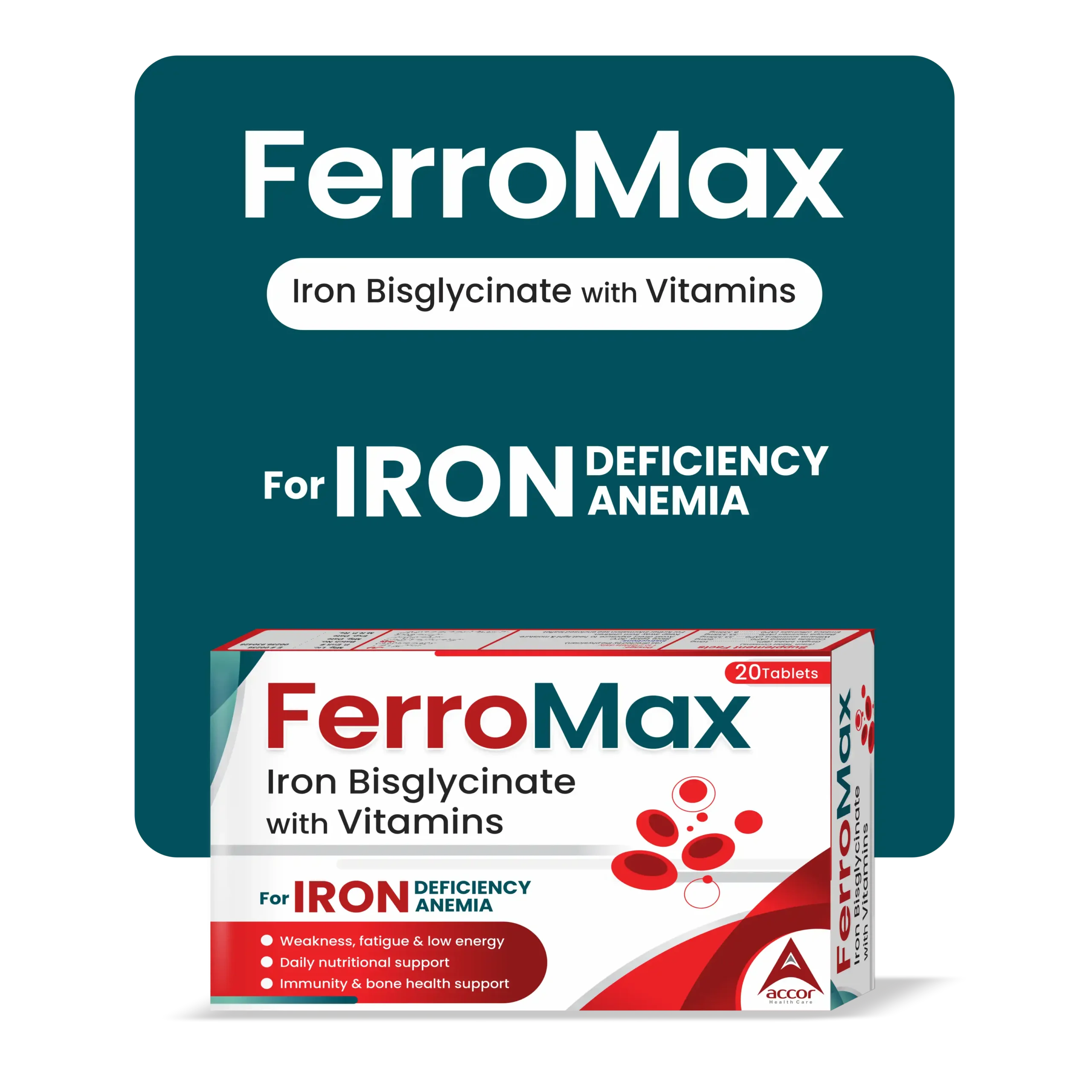 FerroMax Tablet is an advanced multivitamin with iron supplement formulated to combat iron deficiency anemia and support overall health. Iron Bisglycinate is a highly absorbable form of iron, helping to increase hemoglobin levels, reduce weakness and fatigue, and boost energy naturally.