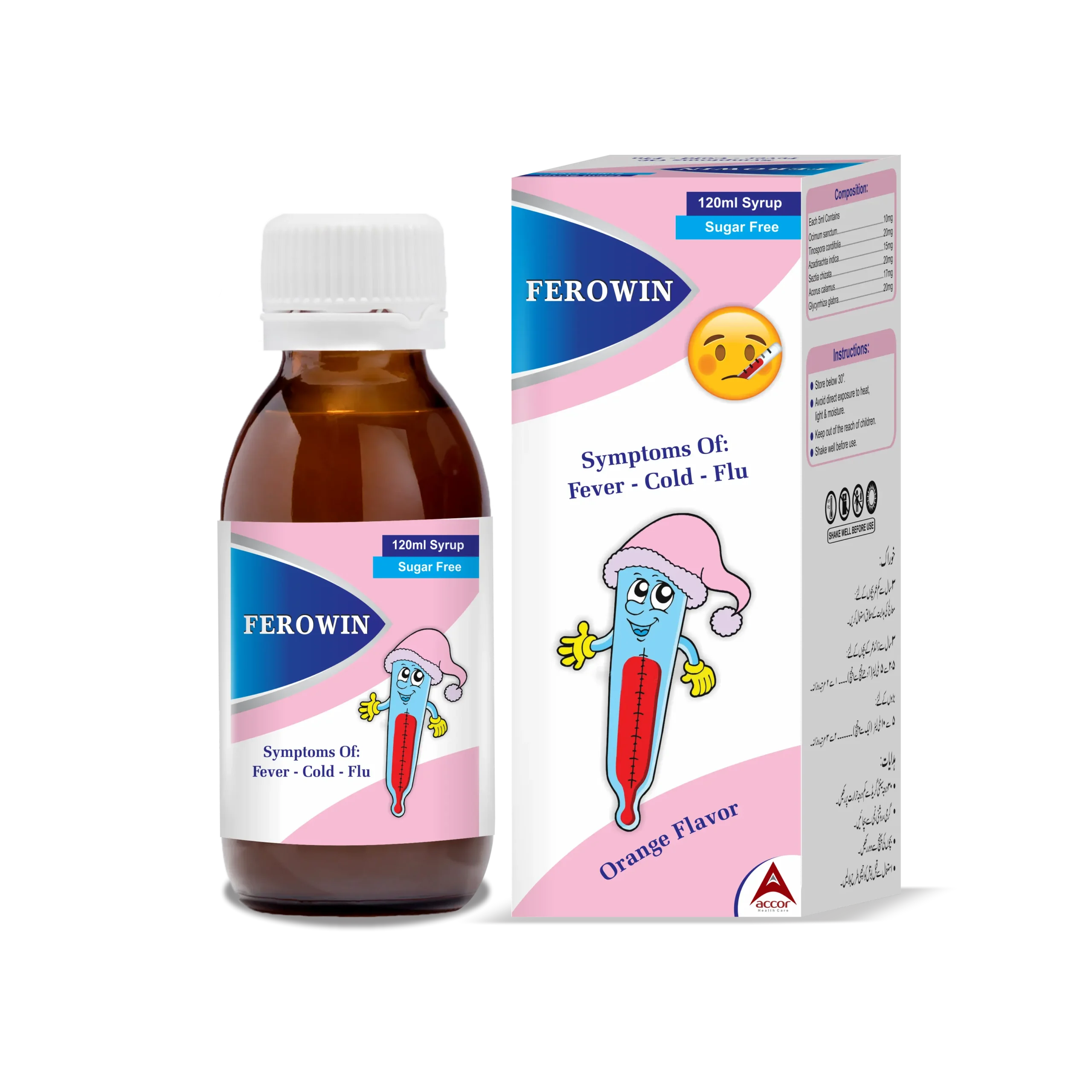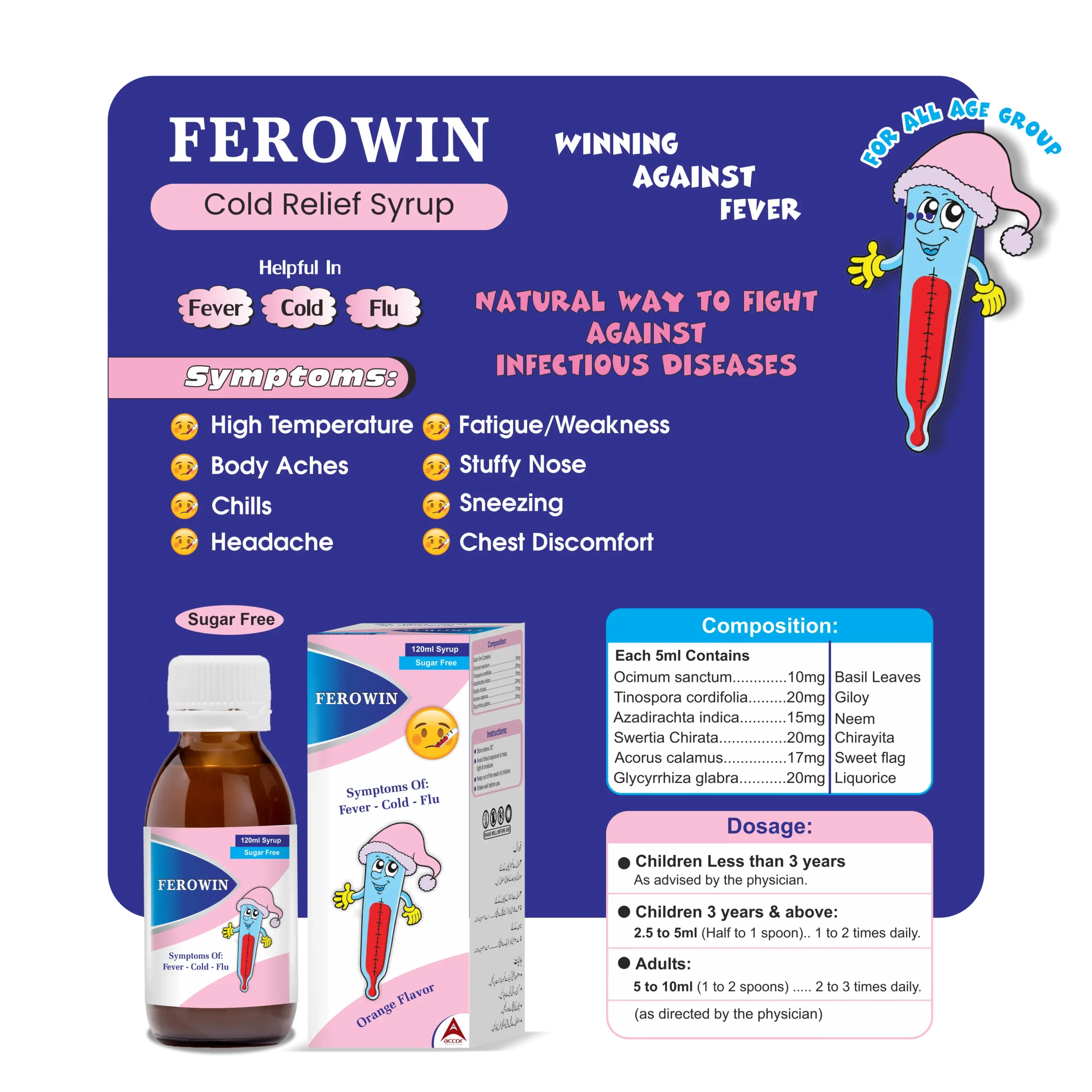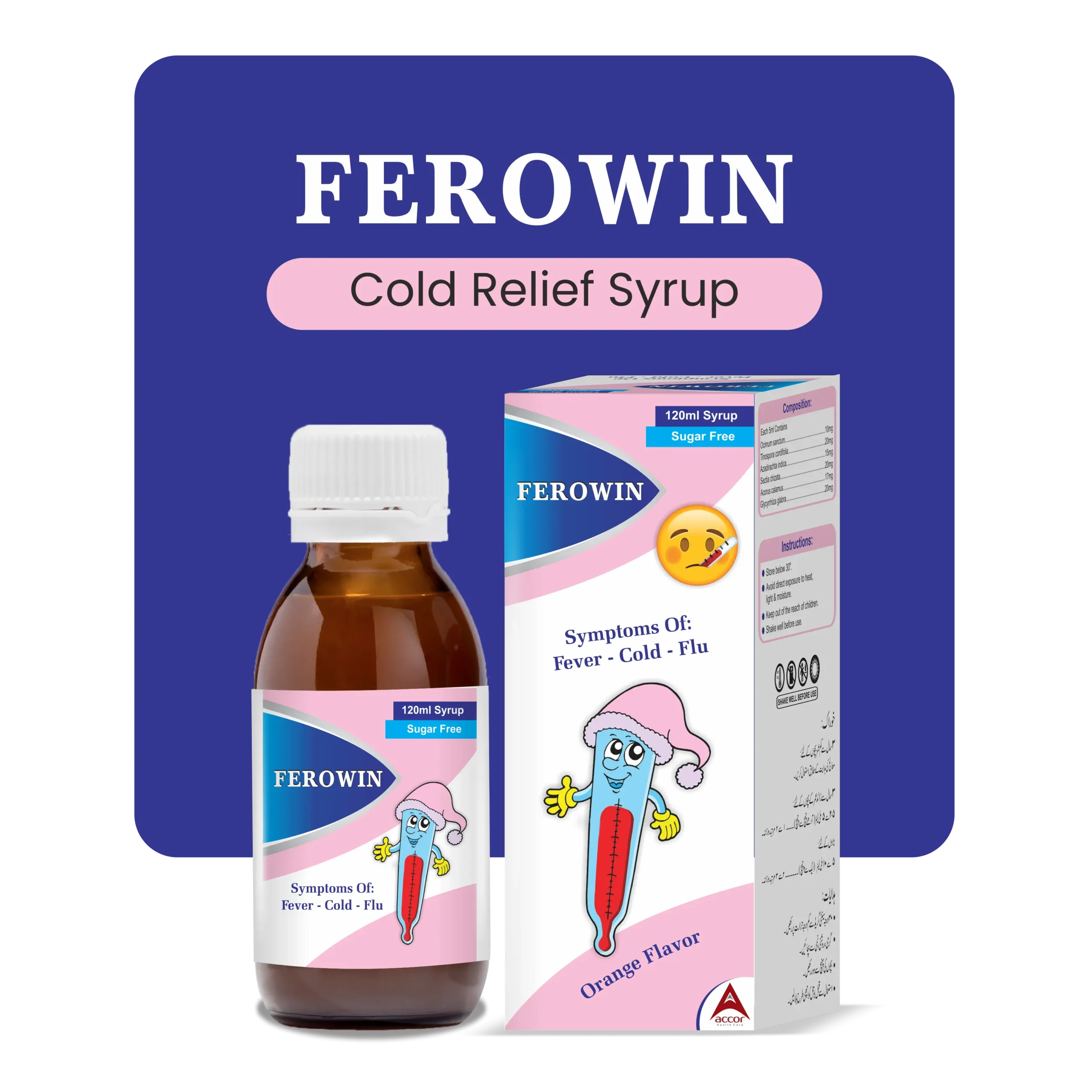 Ferowin is a natural herbal syrup formulated to relieve symptoms of cold, cough, and flu. Enriched with powerful plant extracts, it soothes the throat, boosts immunity, and supports faster recovery without drowsiness.